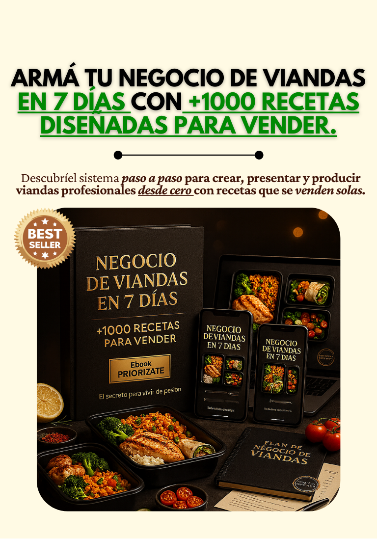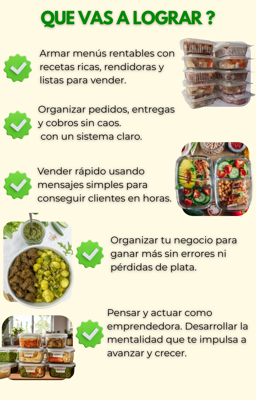 Recibís la guía completa para emprender con viandas y más de 1000 recetas rendidoras, económicas y listas para vender junto con 5 bonus exclusivos.