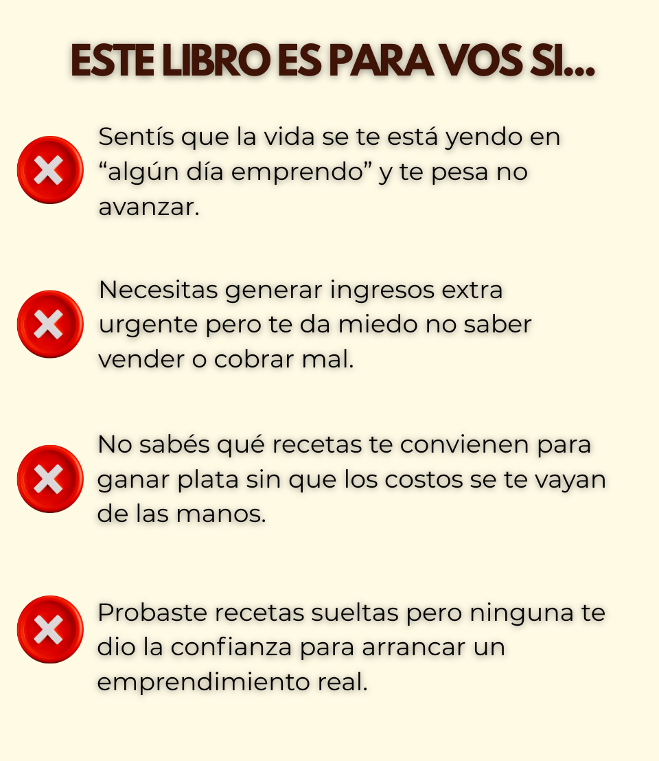Nuestro material está optimizado para vender: recetas probadas, costos calculados, porciones exactas y un sistema claro que evita errores, pérdida de plata y meses de prueba y error.